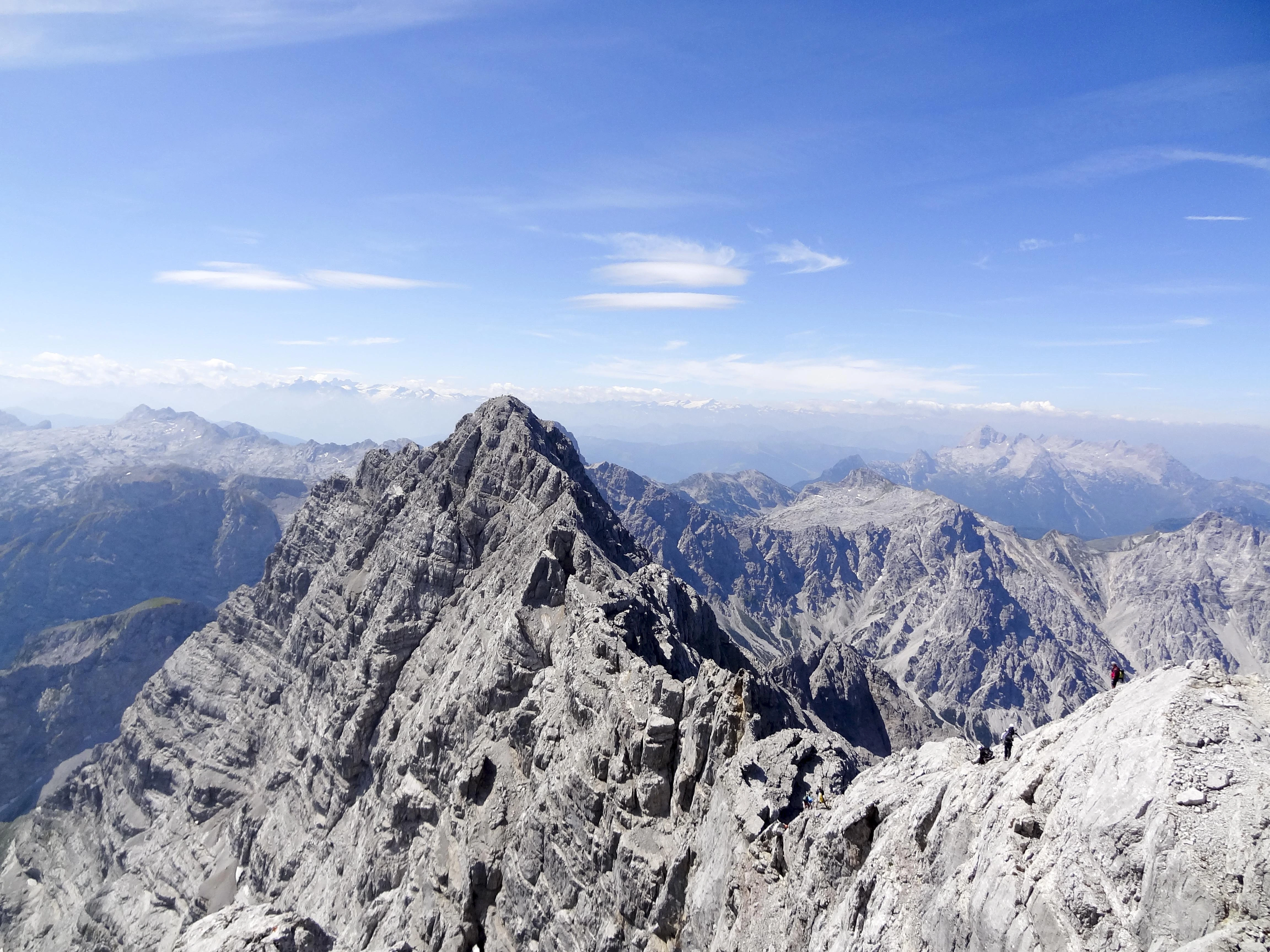Nach einem ausgiebigen Frühstück starten wir den Gipfeltag auf einem anfangs noch gemütlichen Wanderweg zu unserem ersten Gipfel für Heute – das Hocheck (2.651m). Von hier geht’s über einen teilweise versicherten Stig weiter zur Mittelspitze (2.713m). Ab hier beginnen die eigentlichen Schwierigkeiten der Überschreitung. Ausgesetzt und kaum versichert geht es zuerst abkletternd hinunter um dann in einem Auf und Ab am Grat die Südspitze (2.712m) zu erreichen.